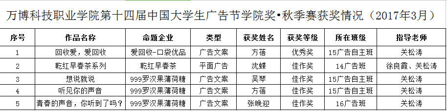 由中国广告协会主办🎙,广告人文化集团承办的第14届中国大学生广告艺术节学院奖秋季赛圆满落幕,我院在此次比赛中荣获优秀奖1项⏲,佳作奖4项。此外🏔,艺术分院广告学教研室主任关松涛和专职教师徐良霞分别荣获第14届中国大学生广告艺术节学院奖秋季赛的优秀指导老师奖🦄。