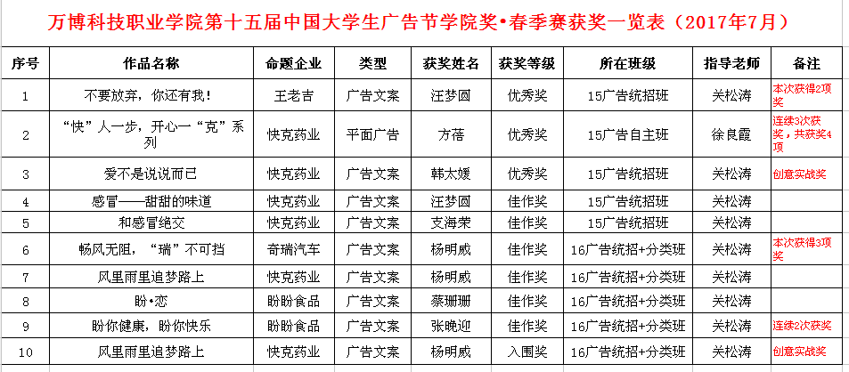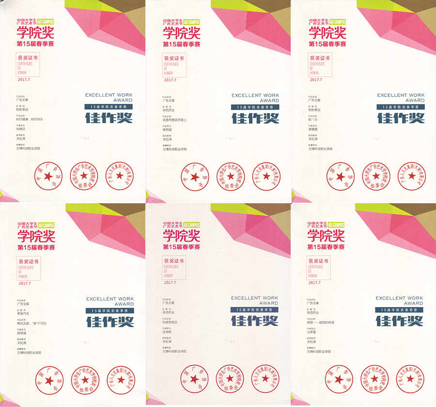 学院奖春季赛自2017年3月12日启动后,在学院各级领导的大力支持下,在广告设计与制作专业的全体教师的细心指导和无私奉献下,在同学们高涨的参赛热情和青春与创意的碰撞下,历经2个多月的时间共创作并提交了参赛作品271件🚹👨🏻🦼➡️,达到历年来参赛提交作品最多数量。最终🫅🏿,我院2015级广告统招班的汪梦圆和韩太媛以及2015广告自主班的方蓓三位同学分别荣获大赛的优秀奖;2015级广告统招班的汪梦圆、支海荣以及2016级广告杨明威、蔡珊珊和张晚迎5位同学分别荣获春季赛佳作奖;2016级广告杨明威荣获创意实战入围奖1项🧜♂️。