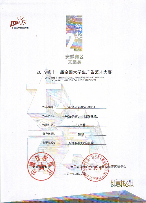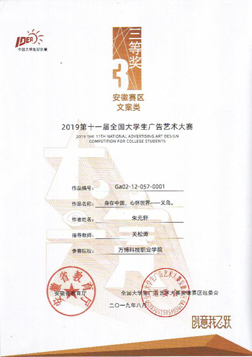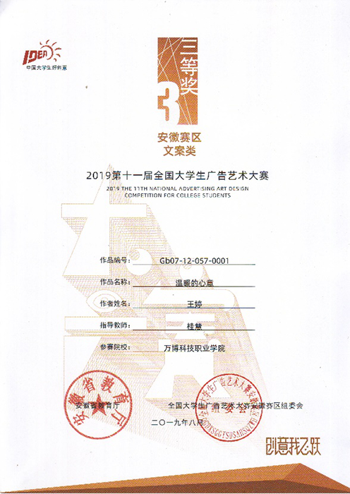 其中,由艺术传媒学院广告传媒教研室专职教师桂慧指导的两个作品——18级广告班张文静同学创作的文案类作品《一杯宜茶时,一口好味道》荣获大赛二等奖🎚,18级广告班王婷同学创作的文案类作品《温暖的心意》荣获大赛三等奖;广告传媒教研室主任关松涛指导的两个作品——17级广告班施健同学创作的平面类作品《轻薄柔滑》荣获大赛三等奖,18级广告班朱元轩同学创作的文案类作品《身在中国,心怀世界——义乌》荣获大赛三等奖🔰。
