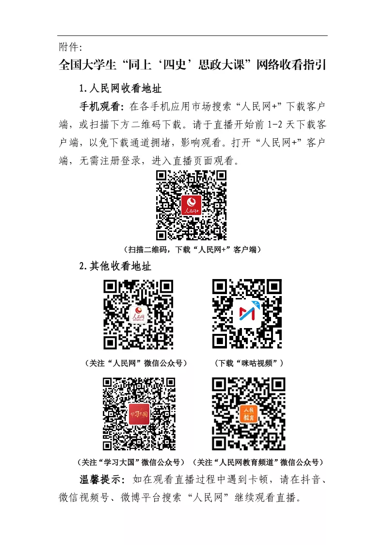 为深入贯彻落实习近平总书记关于深化思想政治理论课改革创新和“大思政课”的重要指示批示精神🅱️🤽🏽,全面落实习近平总书记在党史学习教育动员大会上的重要讲话精神和认真落实中央和省委、省委教育工委关于开展党史学习教育的有关部署安排,按照校党委党史学习教育领导小组具体要求,根据《教育部社科司关于组织全国大学生“同上‘四史’思政大课”的通知》(教社科司函〔2021〕63 号)文件精神,为推进彩神党史学习教育深入扎实开展,现决定组织彩神大学生和思想政治理论课教师参加教育部社科司与人民网联合举办的“同上‘四史’思政大课”活动。现将有关要求通知如下🎣: