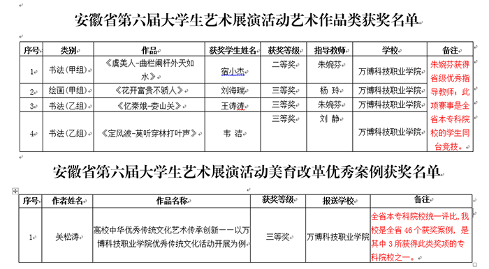 近日🧑🏫,安徽省教育厅发布了《安徽省教育厅关于公布全省第六届大学生艺术展演活动评选结果的通知》,彩神艺术传媒学院师生作品在艺术作品和高校美育改革创新优秀案例两个类别中荣获二等奖1个、三等奖4个以及优秀教师称号1个🧑🏽✈️。