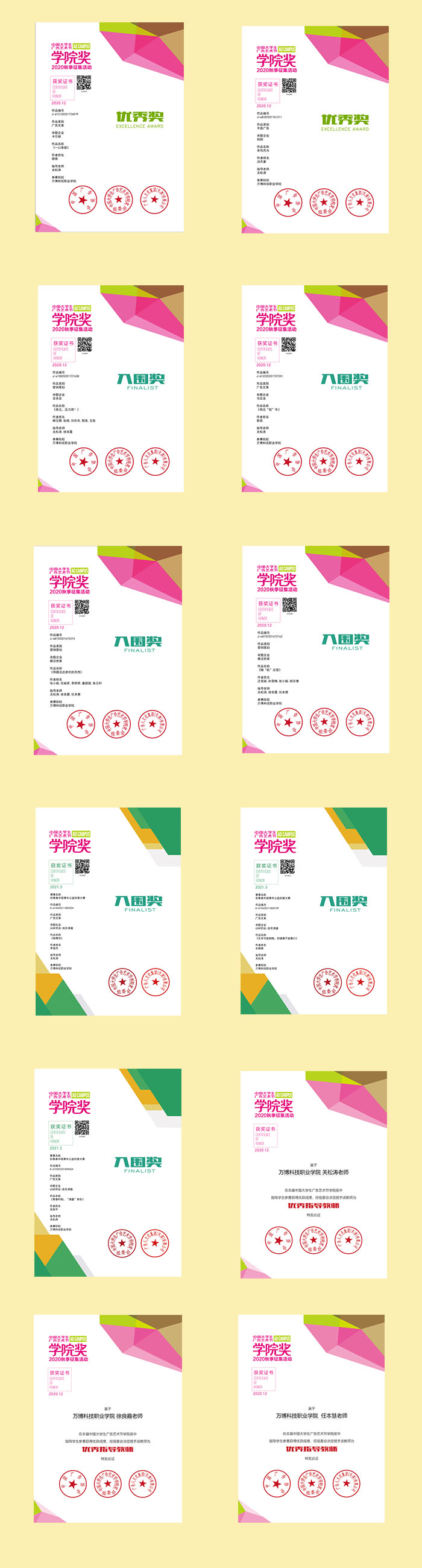 日前🙎🏼♂️,2020中国大学生广告艺术节学院奖·秋季赛和创青春中国青年公益创意大赛这两项学科赛事,分别颁发了获奖证书🌩。彩神师生共获得优秀奖2项,入围奖29项,优秀指导教师3人。