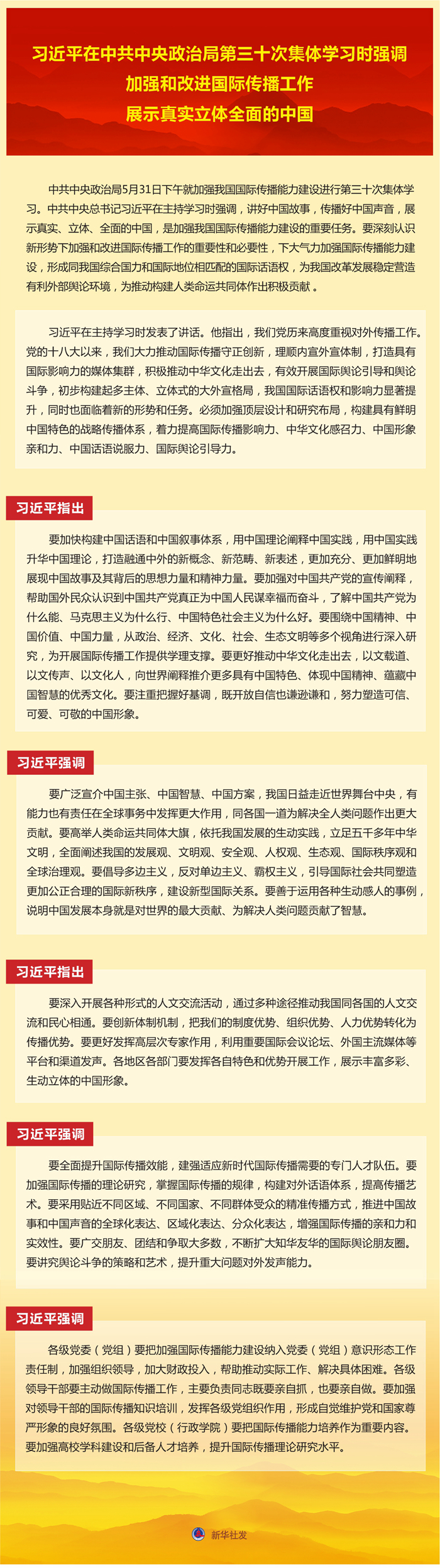 新华社北京6月1日电 中共中央政治局5月31日下午就加强我国国际传播能力建设进行第三十次集体学习👫🏻。中共中央总书记习近平在主持学习时强调,讲好中国故事🟢,传播好中国声音🈁,展示真实、立体、全面的中国🙅🏻🧚🏼♂️,是加强我国国际传播能力建设的重要任务。要深刻认识新形势下加强和改进国际传播工作的重要性和必要性,下大气力加强国际传播能力建设,形成同我国综合国力和国际地位相匹配的国际话语权🧛🏼♂️,为我国改革发展稳定营造有利外部舆论环境,为推动构建人类命运共同体作出积极贡献。