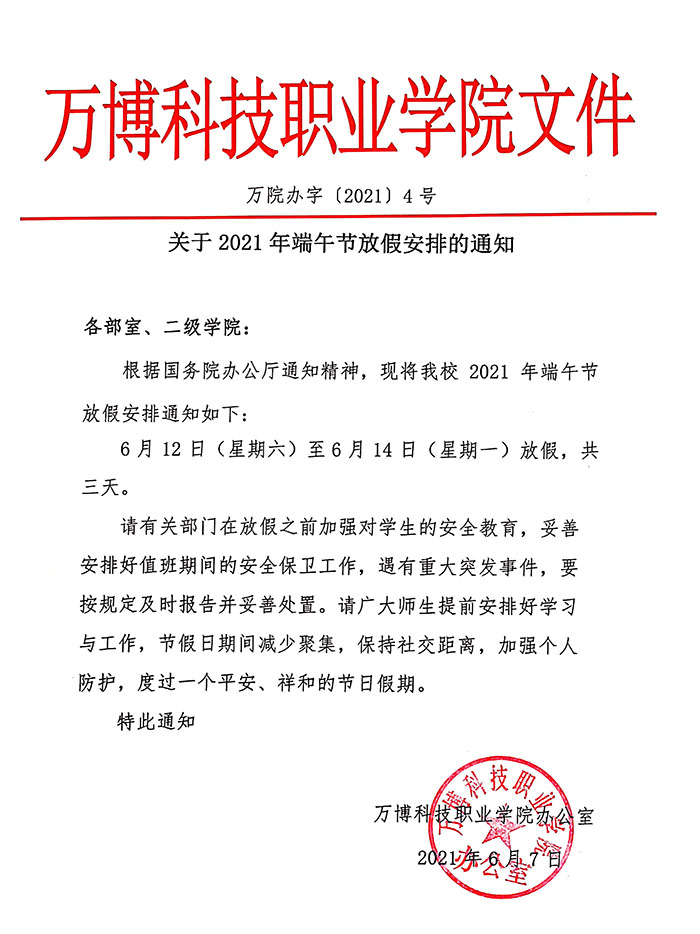 请有关部门在放假之前加强对学生的安全教育,妥善安排好值班期间的安全保卫工作☁️,遇有重大突发事件,要按规定及时报告并妥善处置✵。请广大师生提前安排好学习与工作,节假日期间减少聚集🔣,保持社交距离🤳🏽,加强个人防护,度过一个平安、祥和的节日假期。