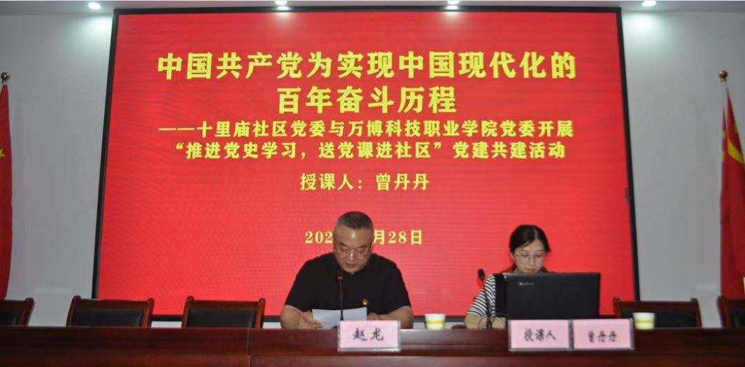 为庆祝中国共产党建党100周年,推进党史学习教育,2021年6月28日🌵,彩神党委携手十里庙社区党委,于6月28日下午开展以“推进党史学习,送党课进社区”为主题的党建共建活动💇🏿♂️。活动由基础部党支部牵头落实,思政课党员教师曾丹丹授课。