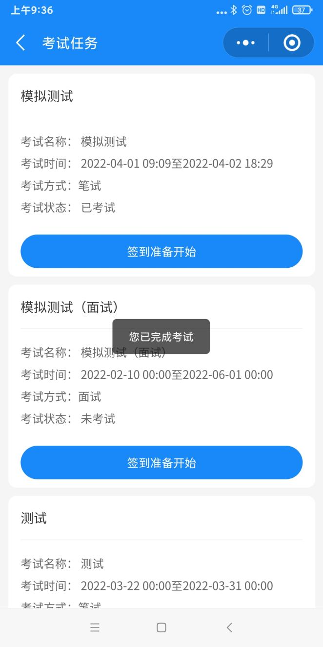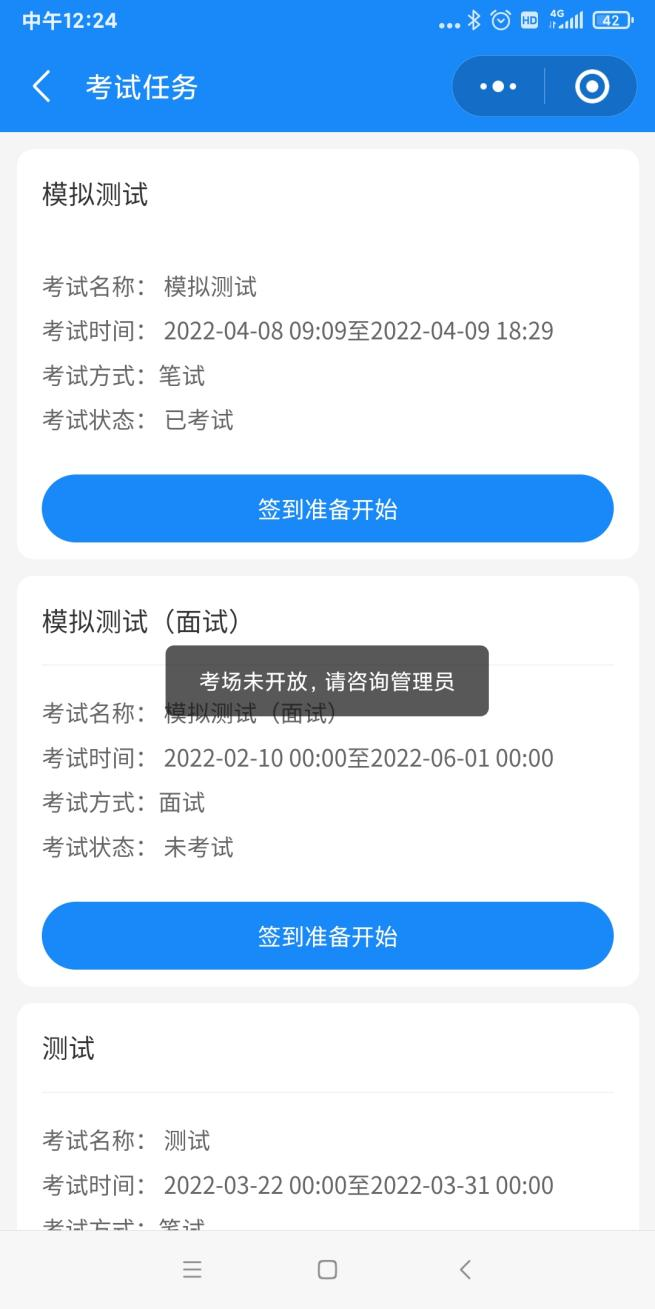 选择进入“考试任务”菜单,出现考试列表页面,考生可以看到自己所对应的考试项目👶🏿,在考试有效时间内点击“签到🥋🏡,准备考试”按键进入候考页面,如出现“考场未开放”或“已完成考试”提示时请核对考试状态与时间或联系值班监考老师;