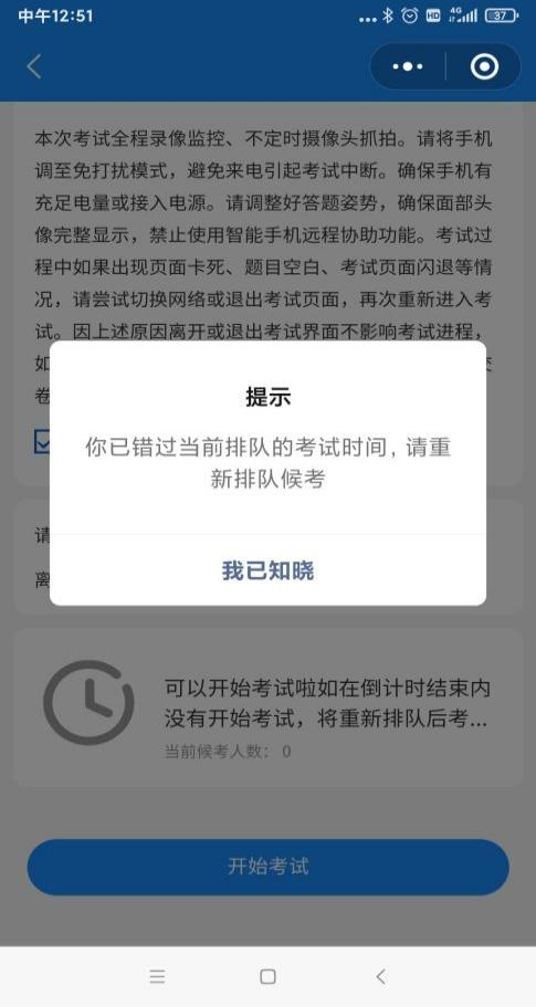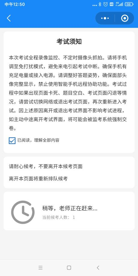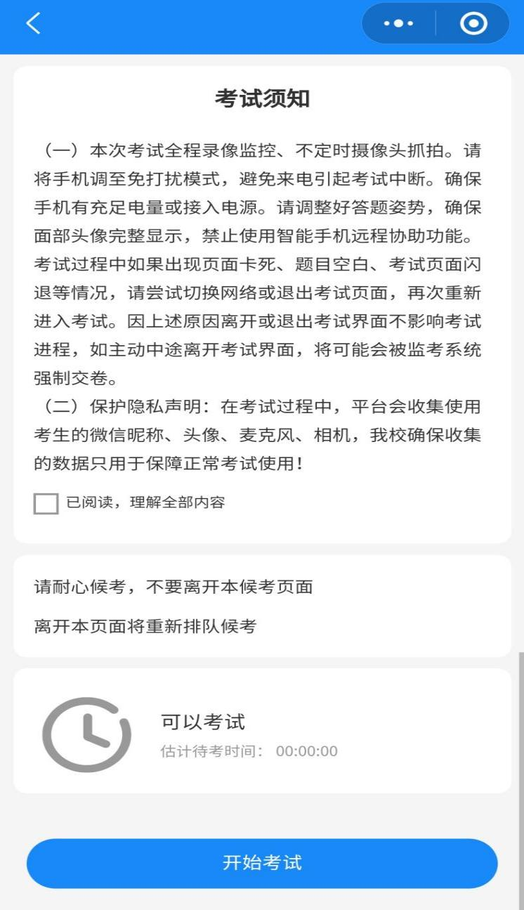 (2)非定时考试🚝👨🏽⚖️:平台自动分配考试资源,如果签到考生超出系统设置的人数时,新进入的考生将要进行排队候考⚠🗿,候考页面中有提示候考时间和排队人数,请考生根据实际排队长度合理安排考试时间🎲👱🏽♂️,如果退出后重新进入候考页面时💇♂️,需要重新排队✴️!