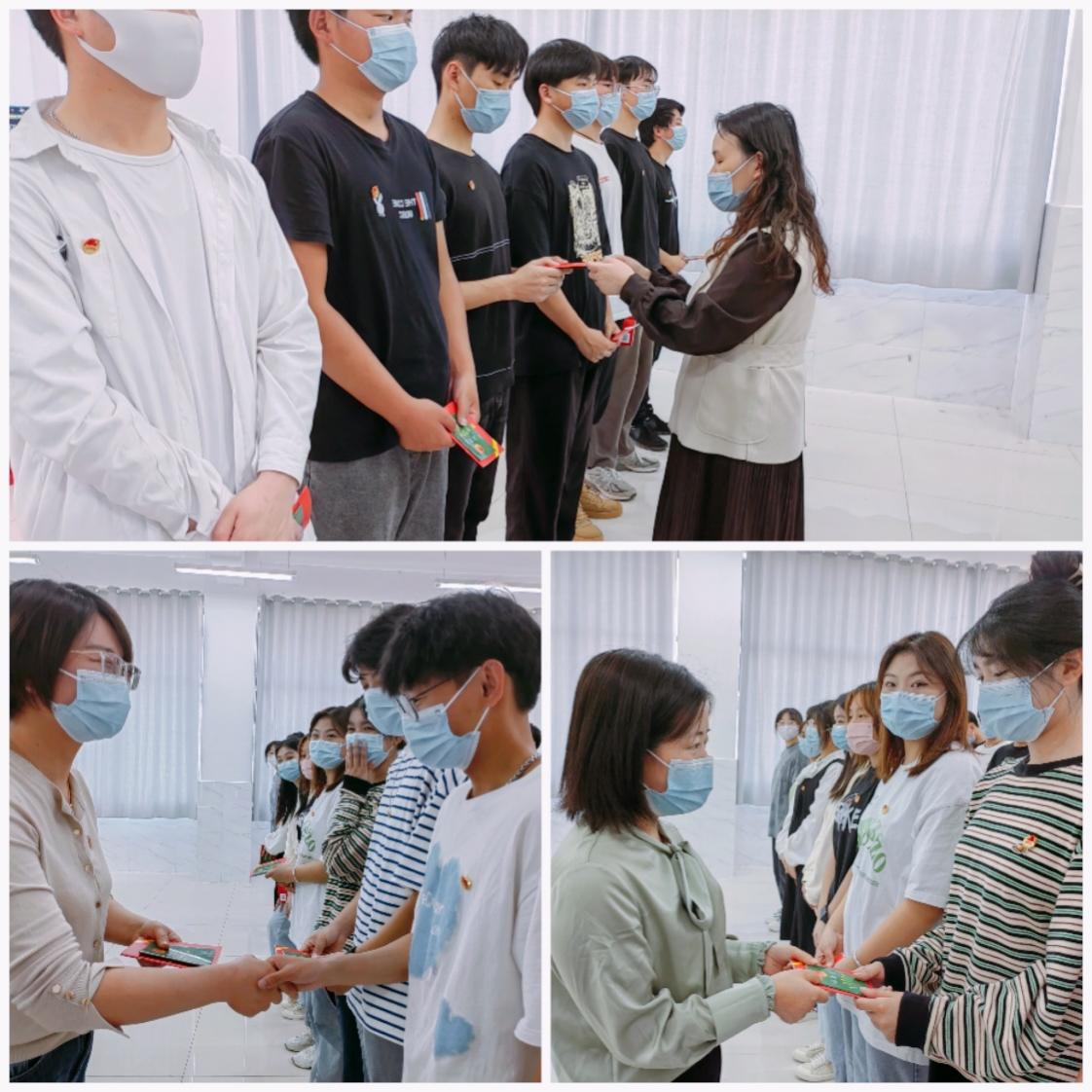 伴着雄壮的国歌声,入团仪式正式开始,主持人阐述了举办此次入团仪式的意义,三位书记为所有新团员门颁发团员证和团章,并逐一佩戴团徽。在校团委老师许鑫宇的带领下,佩戴整齐的新团员们在团旗前庄严宣誓。