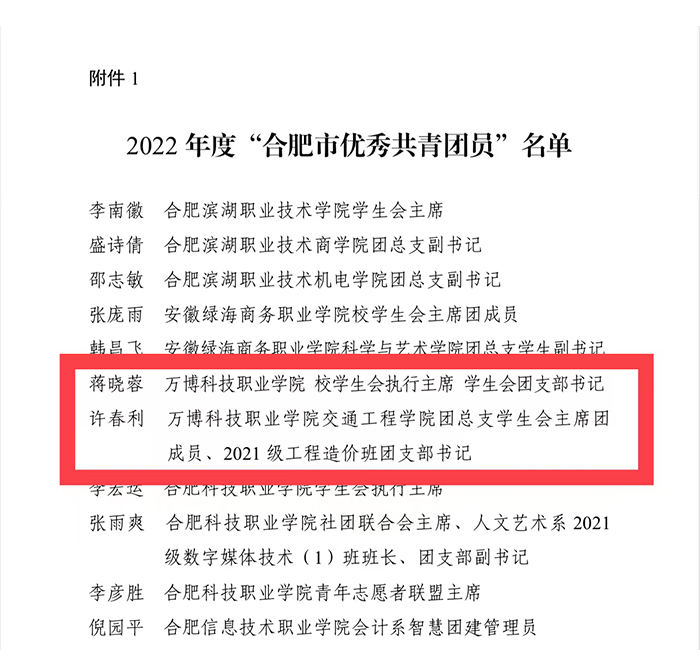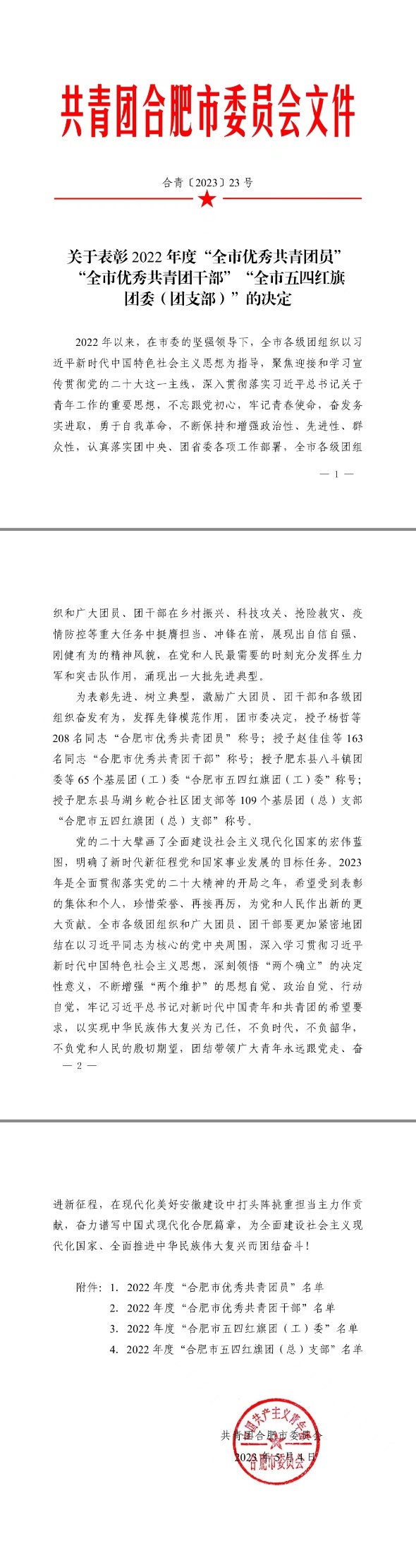 为表彰先进、树立典型🧑🏼🏭,激励广大团员👮🏼♀️、团干部和全市各级团组织奋发有为,发挥先锋模范作用。5月4日🌒,共青团合肥市委下发《关于表彰2022年度“全市优秀共青团员”“全市优秀共青团干部”“全市五四红旗团委(团支部)”的决定》,彩神团委荣获“合肥市五四红旗团委”称号,智能信息学院团总支荣获“合肥市五四红旗团(总)支部”称号,校团委宣传委员许鑫宇荣获“合肥市优秀共青团干部”称号🤦🏻♀️,校学生会执行主席🦅、学生会团支部书记蒋晓蓉,交通工程学院团总支学生会主席团成员、21级工程造价班团支部书记许春利荣获“合肥市优秀共青团员”称号。