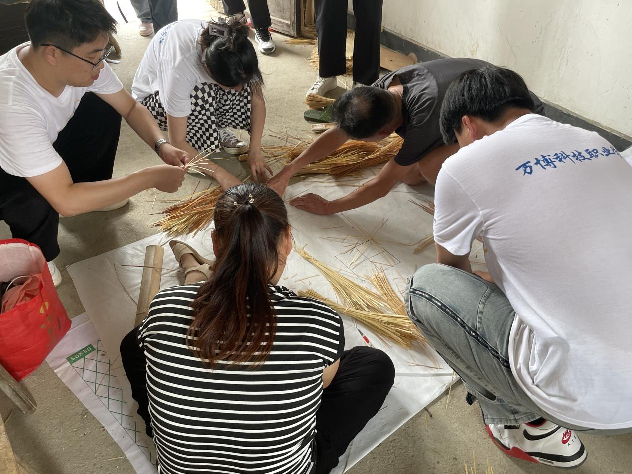第二站,实践队赶赴安徽省非物质文化遗产—唐氏舒席。队员们参观了舒席的制作工艺,学习并了解了舒席的发展历史👦🏽⏮。在老艺人手把手的指导下,队员们纷纷自己动手尝试竹篾编制,感受指尖上的精彩🚣🏽。