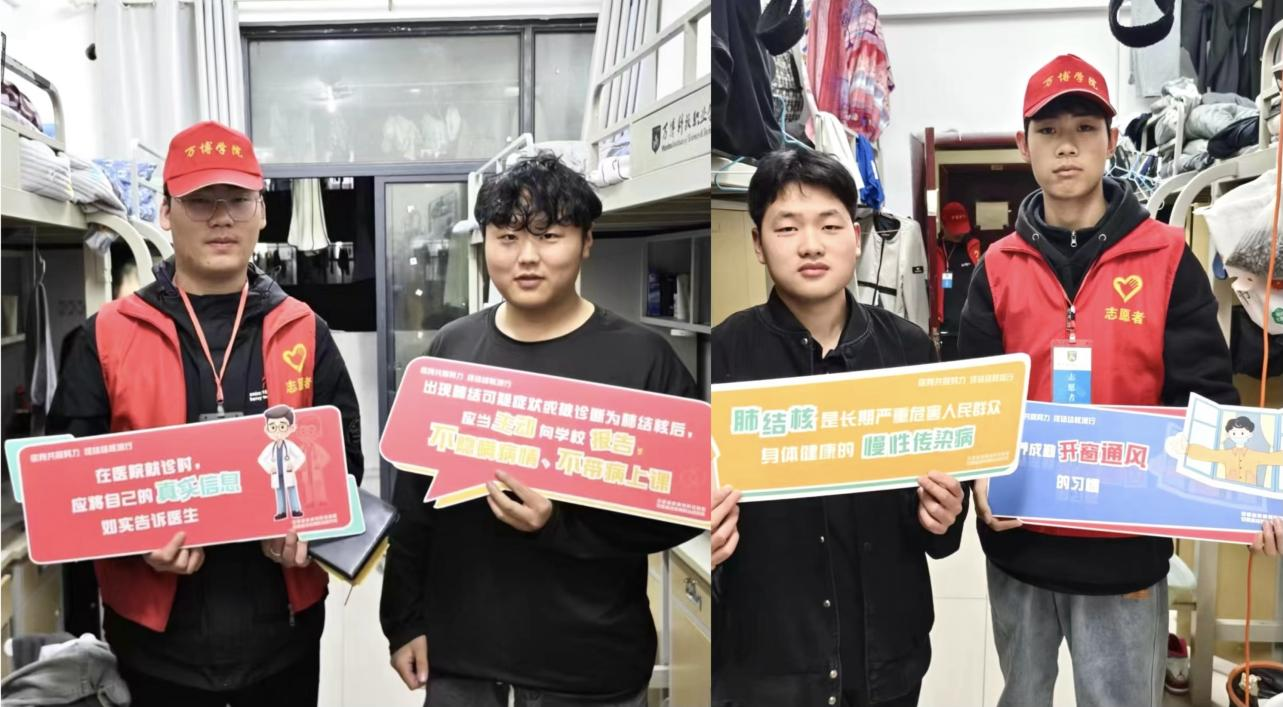 活动中,青年志愿者身穿红色马甲,手持宣传资料,深入每一栋宿舍楼,每一个寝室,通过发放宣传单页、面对面的结防知识宣讲等方式,将肺结核防控知识传递给每位同学,致力打通校园结核病防治知识宣传“最后一公里”。宣传期间🧑🏿🍳,不少同学在听完志愿者们的讲解后,纷纷拿起宣传牌,对着拍摄镜头喊出宣传口号。此刻🙎🏿🧚🏼,寝室里的同学们完成了身份的转换🎆,他们仿佛也成为了宣传结核病防治知识的志愿者。
