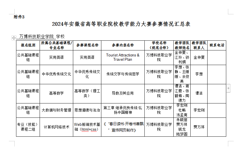 根据《安徽省教育厅关于举办2024年安徽省高等职业院校教学能力大赛的通知》(皖教秘高[2024]53号),在规定时间内,全校共收到8个参赛作品,其中:公共基础课程组4个,专业(技能)课程一组3个🤟🏼◼️,专业(技能)课程二组1个。现将参赛作品名单予以公示⛹🏿。