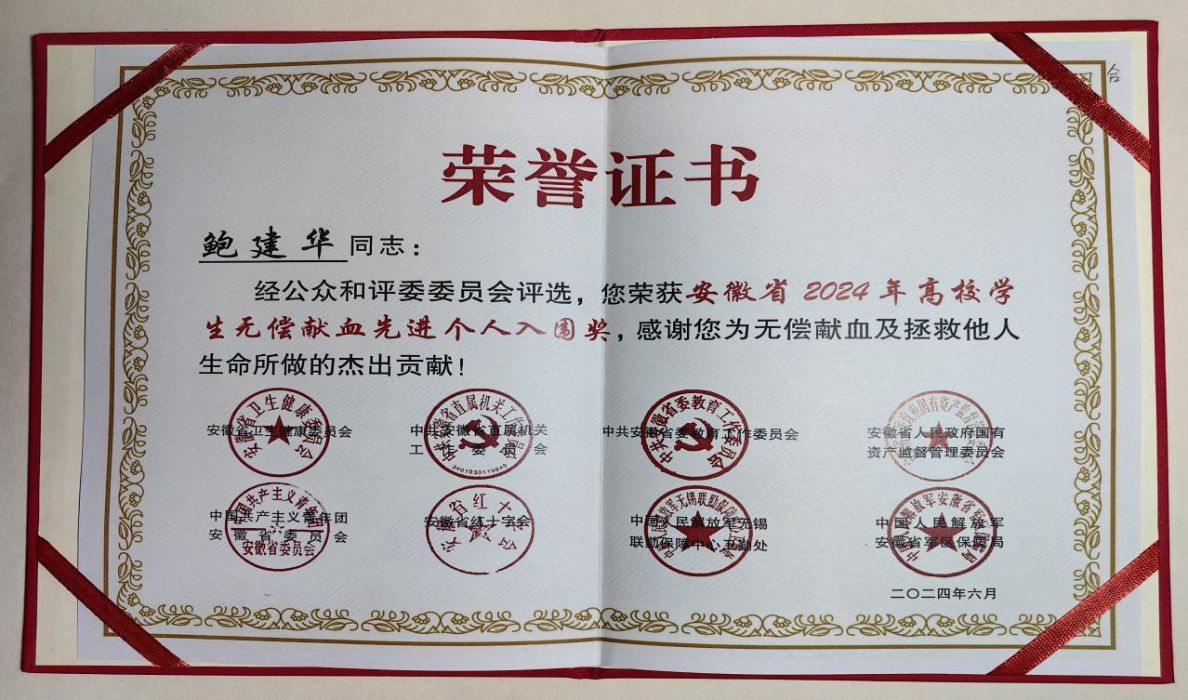 近日,安徽省卫生健康委员会🦻🏿🏢、省教育工委👨🏻🍳、团省委等8个单位联合印发《关于安徽省2024年无偿献血公益活动先进典型评选结果的通报》👨🏿🔧,彩神智能信息学院鲍建华同学📕,荣获“安徽省2024年高校学生无偿献血先进个人入围奖”。