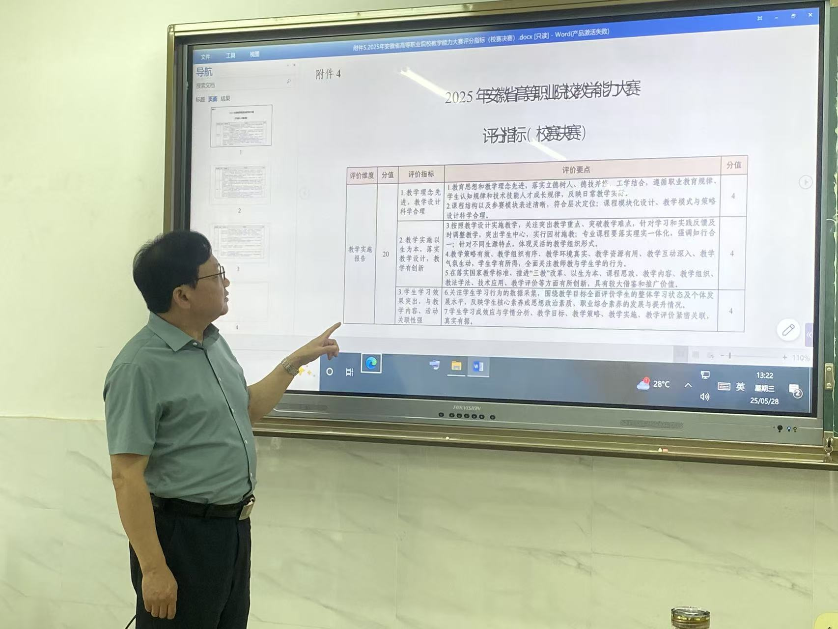 随后,他详细解读了2025年安徽省职业院校教学能力大赛评分指标。并提出四点要求:一是参赛队员要全力以赴,追求卓越⛳️,摒弃畏难情绪,将大赛视为锤炼自我、提升自我的绝佳契机;二是要对标方案☃️🧇,提升亮点,深入研读教学能力大赛方案的最新要求,精心打磨作品🤛🏿,提升作品亮点🤦🏿♀️;三是在备赛时要做到精细化、规范化,注重细节把控,充分体现教学能力水平;四是团队队员之间要做好协调分工,充分交流学习➿,做到互通有无,共同提升,高质量完成备赛工作。